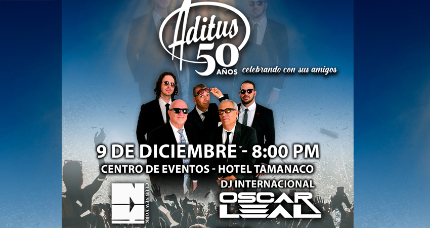 El 50 aniversario de Aditus será presentado por el Circuito Éxitos y estará bajo la producción de Eventos Globales. Para esta presentación, la banda tiene preparadas sorpresas especiales, incluyendo a diversos artistas como invitados especiales. Como parte de esta celebración se unirá el Club New York y el encargado de poner el ambiente musical será el Dj internacional Oscar Leal.