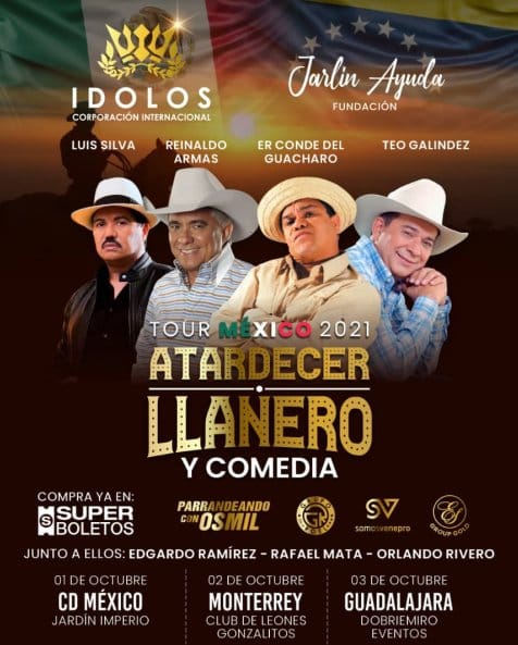 El Tour “Atardecer Llanero y Comedia” México 2021 realizará paradas en Ciudad de México (Jardín Imperio, 01 de octubre), en Monterrey (Club de Leones Gonzalitos, 02 de octubre) y en Guadalajara (Dobriemiro Eventos, 03 de octubre). Los boletos se encuentras disponibles en www.superboletos.com