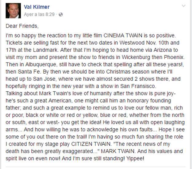 Y la carta termina con una cita en donde Kilmer parafrasea al artista que representa en su montaje: “Las recientes noticias sobre mi muerte han sido extremadamente exageradas”, aseguró el actor.
