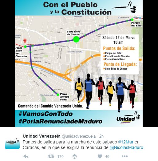 La marcha partirá desde tres puntos de la capital que serán Parque del Este, la plaza Brión de Chacaíto y la plaza Alfredo Sadel de Las Mercedes, a partir de las 10:00 de la mañana, donde culminará en una gran concentración ubicada en la calle Élice de Chacao.