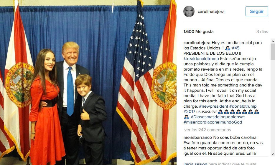 Después de que el presidente número 45 de los EEUU, Donald Trump, fuera juramentado oficialmente el viernes 20 de enero fueron muchas las críticas y opiniones que recibió de parte de muchos y sobre todo por los latinos. Sin embargo, hay personas que confían en él y una de ellas es la bellísima actriz y modelo venezolana, Carolina Tejera, actualmente residenciada en el país norteamericano.