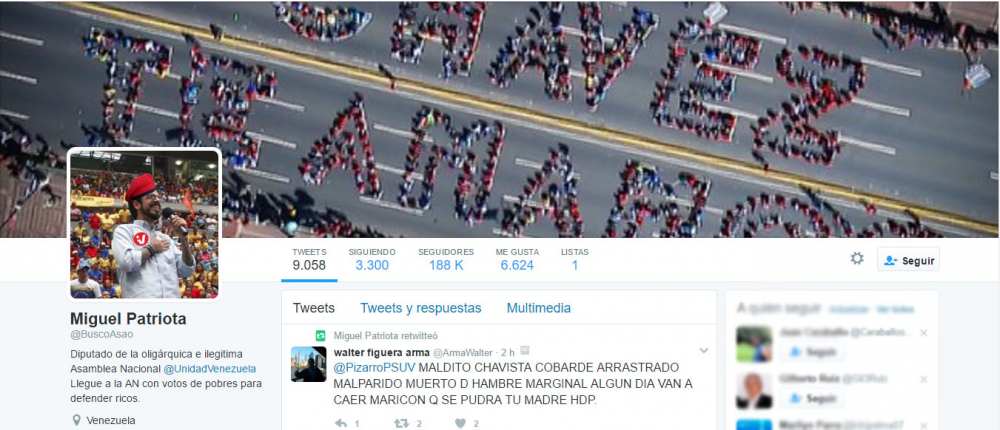 Además de cambiarle su cuenta de @Miguel_Pizarro a @MiguelPatriota luego @BuscoAsao, borrar los tweets más recientes de su cronología hasta el 2015, y hacerle ajustes a su descripción, decoraron por completo su foto de perfil colocándole una insignia del Psuv y un gorro de color rojo al más puro estilo de Mario Bros, al igual que su imagen de fondo. A continuación la imagen: