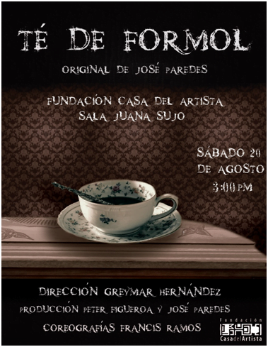 El sábado 20 de agosto se estrenará en la Fundación Casa del Artista la obra “Té de Formol”, escrita por José Paredes, dirigida por Greymar Hernández y producida por Peter Figueroa.