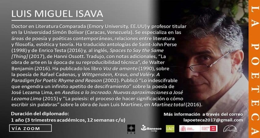 La Fundación La Poeteca anuncia la convocatoria para el primer Diplomado de Reflexión y Creación Poética, en alianza con Banesco, Fundación para la Cultura Urbana, Embajada de España y Latin American Literature Today. Los interesados podrán aplicar para su selección enviando una serie de requisitos desde el 2 de agosto hasta el 3 de septiembre. Los seleccionados serán anunciados el 13 de septiembre.