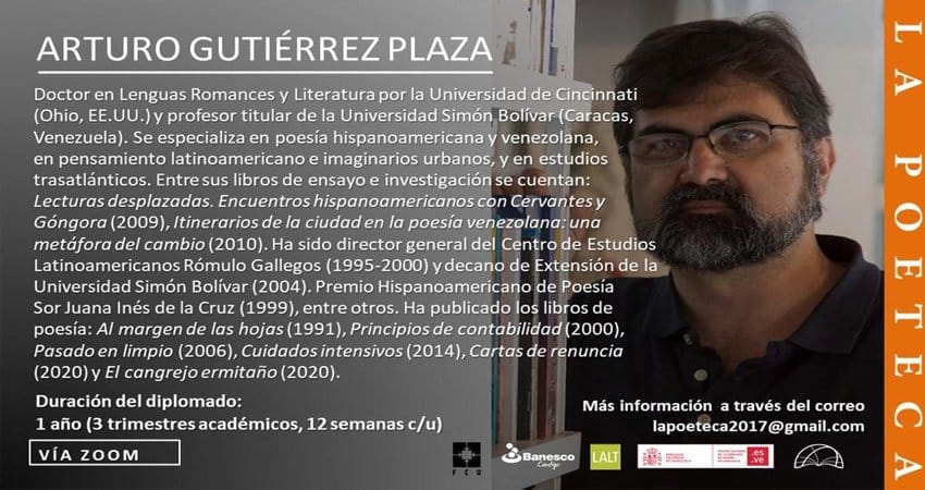 La Fundación La Poeteca anuncia la convocatoria para el primer Diplomado de Reflexión y Creación Poética, en alianza con Banesco, Fundación para la Cultura Urbana, Embajada de España y Latin American Literature Today. Los interesados podrán aplicar para su selección enviando una serie de requisitos desde el 2 de agosto hasta el 3 de septiembre. Los seleccionados serán anunciados el 13 de septiembre.