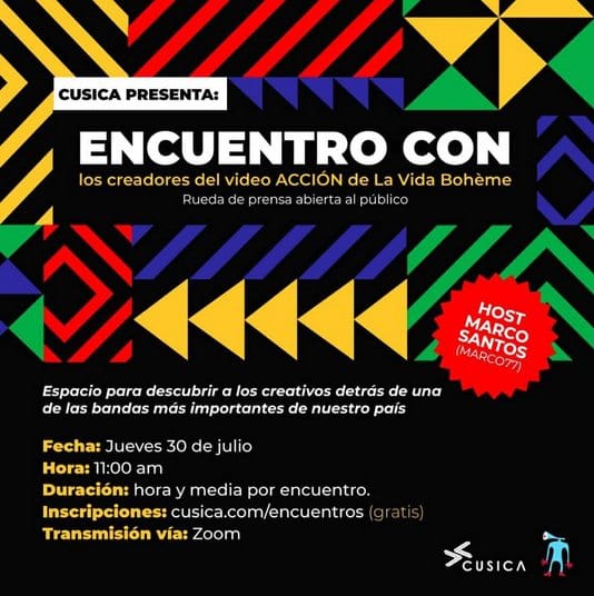 Con un registro gratuito por www.cusica.com/encuentros y junto a la convocatoria de medios realizada por Señor Luc [@senor.luc]. Los participantes serán protagonistas de un conversatorio único; donde se reunirán, Joaquín Salim, director del video ACCIÓN, Basil Fauchier, cinematógrafo y Guille Betancourt, productor del mismo; junto a Enrique Márquez, manager de la banda y los integrantes de La Vida Bohème, con el fin de informar y compartir detalles relacionado a los próximos lanzamientos de la banda y detalles del mencionado videoclip. Todo esto en compañía de Marco 77 [@djmarco77], quién guiará esta tertulia cargada de creatividad.