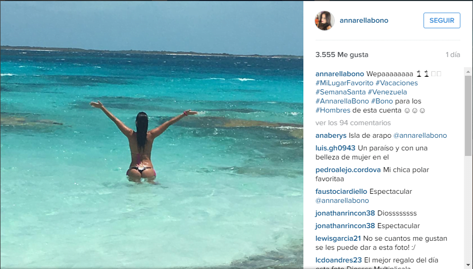 Como la cosa está tan difícil, no hay nada mejor que una semana santa llena de mucha relajación y entretenimiento. Así fue como Annarella Bono, animadora venezolana, decidió pasar estos días de asueto bronceándose y disfrutando de las hermosas playas de Los Roques y compartió varias gráficas y videos en su cuenta en Instagram.