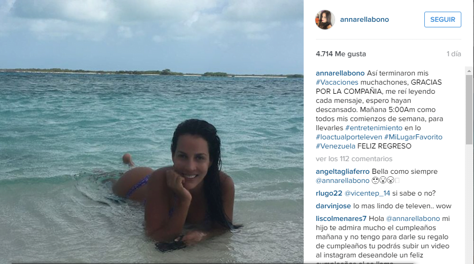 “Así terminaron mis #Vacaciones muchachones, GRACIAS POR LA COMPAÑIA, me reí leyendo cada mensaje, espero hayan descansado. Mañana 5:00Am como todos mis comienzos de semana, para llevarles #entretenimiento en lo#loactualporteleven #MiLugarFavorito#Venezuela FELIZ REGRESO”, escribió Bono en la ultima fotografia que publicó de su viaje.