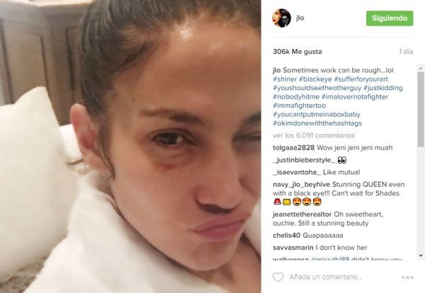 “A veces el trabajo puede ser duro”, escribió López junto a la fotografía. “Nadie me golpeó y soy una amante no una luchadora”, agrega la Diva del Bronx en sus hashtags, por lo que no hay que alarmarse al respecto.