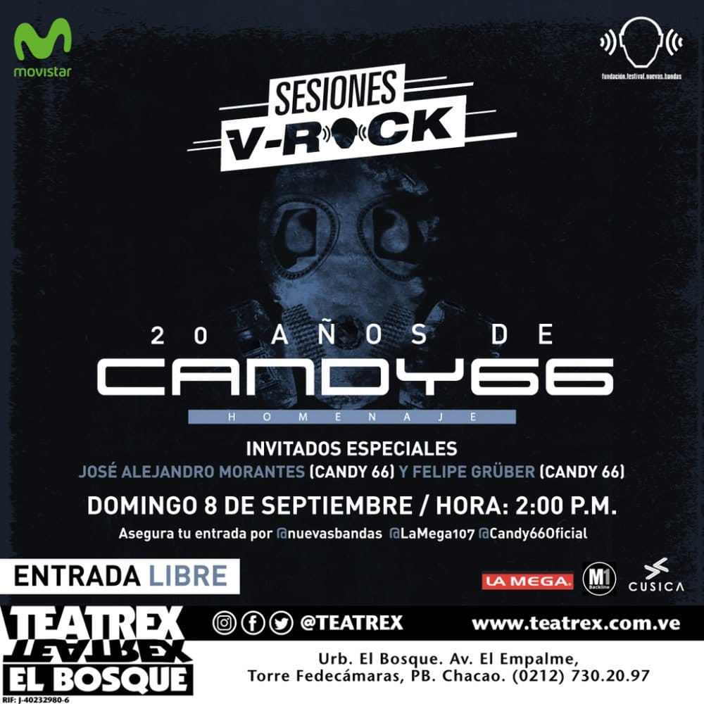 La Fundación Nuevas Bandas y Movistar anuncian una segunda fecha de las Sesiones V-Rock: 20 años Candy 66, a realizarse el domingo 8 de septiembre, a las 2:00 p.m., en Teatrex El Bosque. Los 66: Felipe Grüber y José Alejandro Morantes, guitarristas de la banda homenajeada, participarán como invitados en esta función.