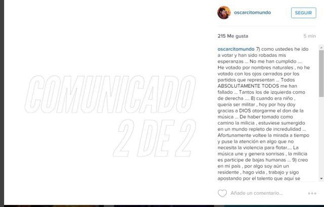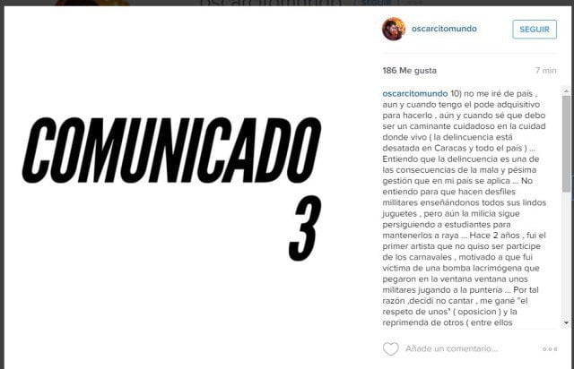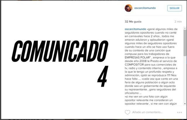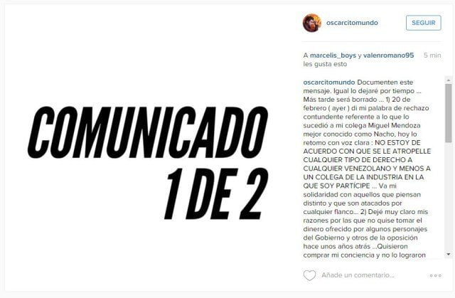 Tras todo el problema que pasó con Miguel Ignacio Mendoza en el aeropuerto de Maiquetía el pasado sábado 20 de febrero, día en el que se presentaba para el concierto #GritoPorLaLibertad en Caracas para exigir la liberación de Leopoldo López, el cantante Oscarcito mediante su cuenta de Instagram dio una fuerte opinión con respecto a lo sucedido y reveló su posición política.