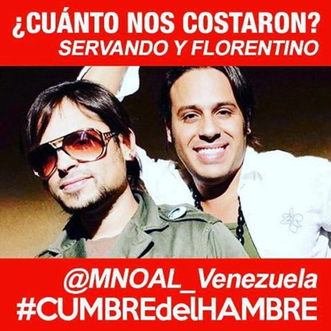 “Criminal ataque al pueblo venezolano. 150 mil millones cuesta esa cumbre mientras los niños mueren de hambre”, dijo el actor tras publicar una imagen en su cuenta de Instagram en donde aparece Servando y Florentino, quienes cantaron en el evento.