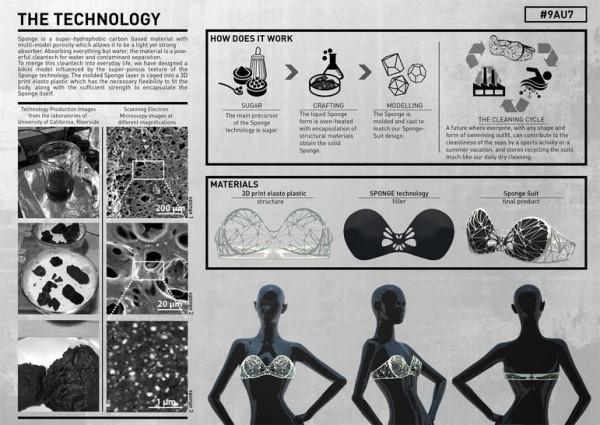 Sponge Suit es un bikini impreso en 3D cuyo proceso de elaboración se llevó cuatro años por los ingenieros, se piensa que sería capaz de recolectar desechos de petróleo y químicos ya que puede atraer 25 veces su peso.