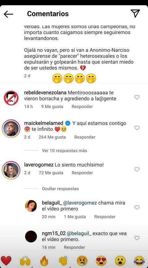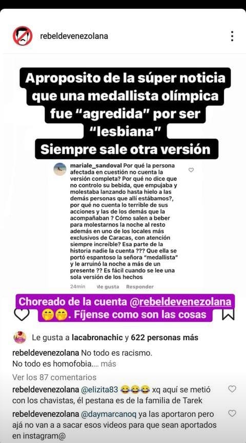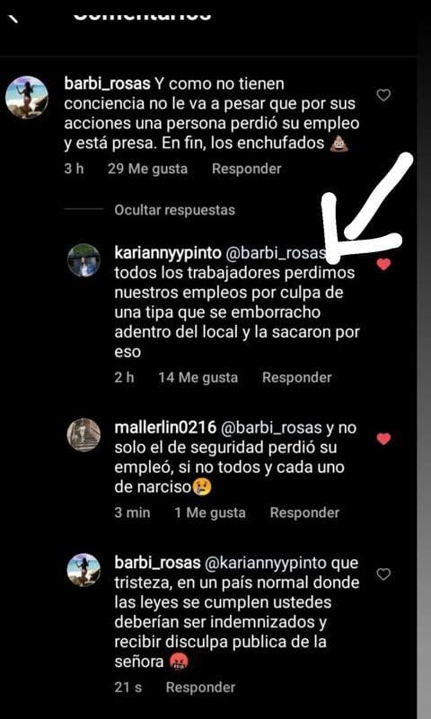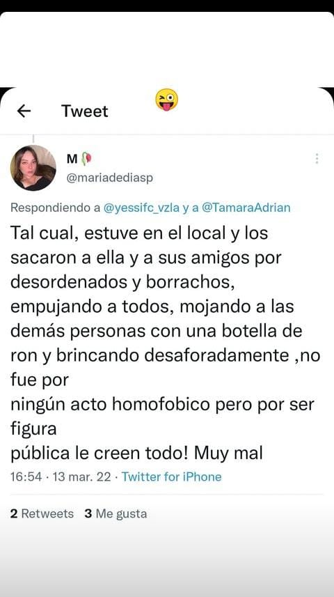 «¿Porque la persona afectada en cuestión no cuenta versión completa? ¿Porque no dice que no controló su bebida, que empujaba y molestaba lanzando hasta hielo a las demás personas que allí estábamos? ¿Porque no cuenta lo terrible de sus acciones y las de los demás que la acompañaban?.» señaló la usuaria de Instagram @mariale_sandoval.