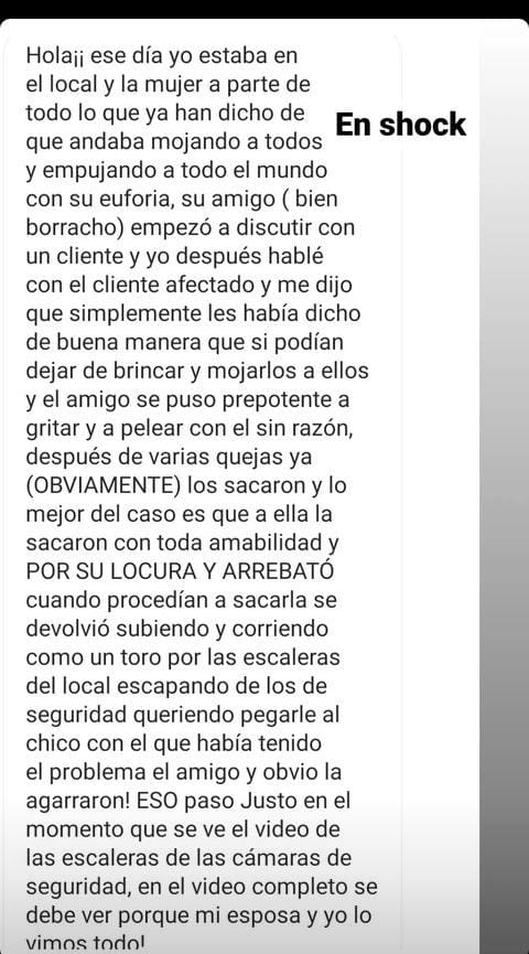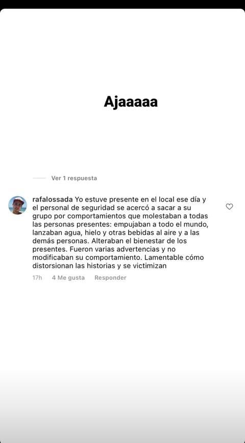 «Yo estuve presente en el local ese día y el personal de seguridad se acercó a sacar a su grupo por comportamientos que molestaban a todas las personas presentes: empujaban a todo el mundo, lanzaban agua, hielo y otras bebidas al aire y a las demás personas. Alteraban el bienestar de los presentes. Fueron varias advertencias y no modificaban su comportamiento. Lamentable como distorsionan las historias y se victimizan.» explicó uno de los presentes @rafalossada.