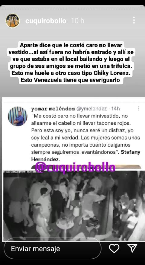 Según la revista GossipVzla la cuenta de Instagram @cuquirobollo recopiló algunas declaraciones de personas presentes en el local, destacando que Hernández y sus amigos agredió físicamente a otros mientras estaba bajo efectos del alcohol y mojaban a los demás con agua, hielo, y con una botella de ron.