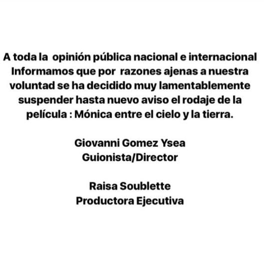 “A toda la opinión pública nacional e internacional. Informamos que por razones ajenas a nuestra voluntad se ha decidido muy lamentablemente suspender hasta nuevo aviso el rodaje de la película: Mónica entre el cielo y la tierra. Giovanni Gómez Ysea, Guionista/Director. Raisa Soublette, Productora Ejecutiva”, se lee en la nota en cuestión.