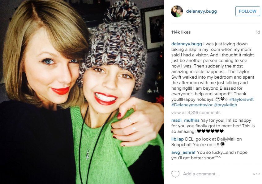 “Solo estaba descansando y a punto de dormir cuando mi mamá me dijo que tenía visitas. Pensé que sería una persona que venía a ver cómo iba. De repente, un hermoso milagro pasó, era Taylor Swift entrando a mi cuarto para pasar una tarde conmigo, estoy más que agradecida. Gracias por el apoyo. Felices fiestas”, publicó Delaney en su Instagram.