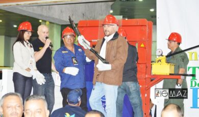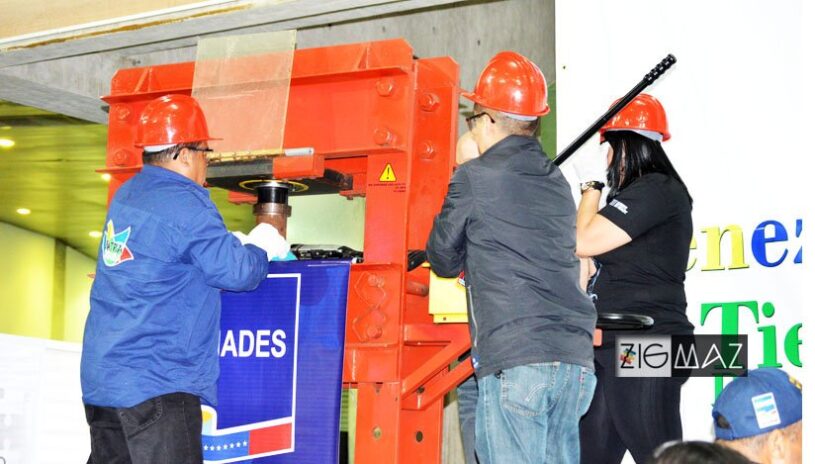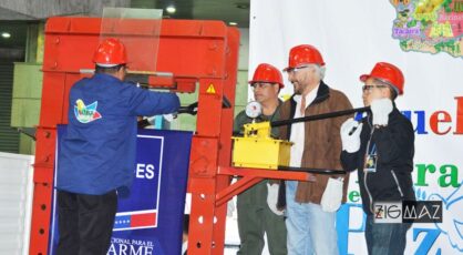 Con este lema el viceministro de Investigación Penal, Saúl Ultrera, se prepara con los guantes para usar la prensa unitilizadora de armas. Ultrera muestra la arma que acababa de inutilizar que quedó prácticamente inservible. Explicó que luego de que el Cicpc recibe las armas y las inutiliza estas pasan al Daes y allí esperan un período de 180 días para trasladarlas a una siderúrgica en el estado Lara para ser destruidas. Después la fiscal superior, Marisela Lucena, acompañada por el viceministro Ultrera inutilizan otra arma. Por último el actor de muchas y legendarias novelas criollas y de la nueva telenovela de Tves Guerreras y Centauros, Henry Galué, también uso la prensa para destruir una escopeta.